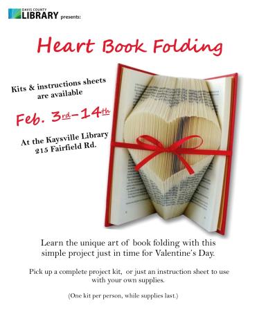 Come pick up a Heart Book Folding Kit at the Kaysville Library. Repurpose a discarded book and make a fun heart decoration. Patrons can pick up the instruction sheets and use their own supplies or select a book and get the ribbon and instruction sheets. Patrons will need to have a ruler that has centimeters and glue to attach the ribbon.